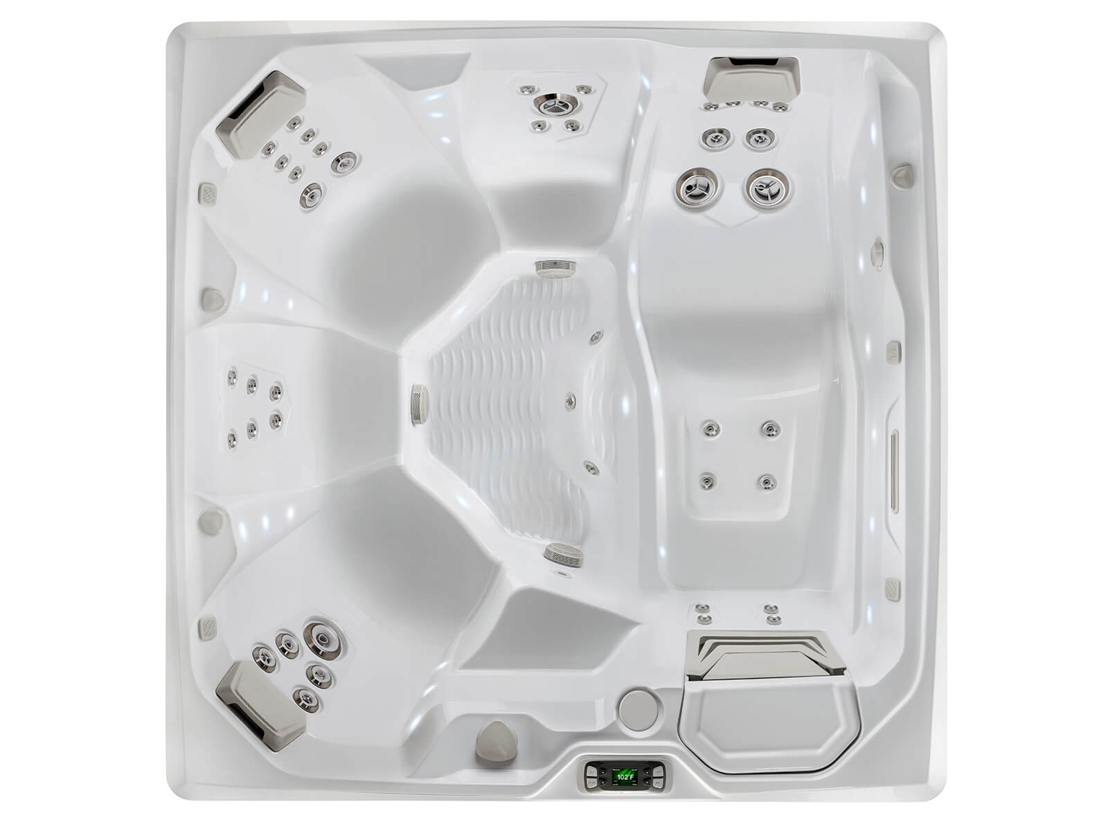 The interior lighting system features multiple points of LED light that accent the contours of the spa shell. Two exterior LED lights integrate with the front corners of the spa, creating an elegant look.