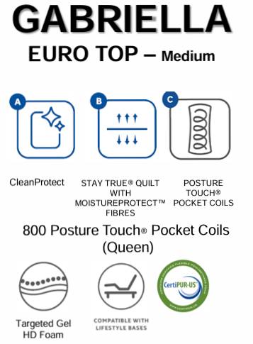 The Gabriella Medium Euro Top mattress by Sealy Posturepedic Plus features a CleanProtect™ cover to help maintain freshness and reduce bacterial-associated staining, Targeted Gel HD Foam to ensure your body stays properly supported while you sleep, the Stay True® Quilt with MoistureProtect™ Fibres designed to draw moisture away from your body helping to keep you more comfortable, the Sealy StableEdge™ HD to keep coils securely in place for enhanced mattress stability and the PostureTouch® Pocket Coils for even mor targeted support and to reduce motion transfer. This mattress will bring all the support and comfort that you need to get a good night's sleep.