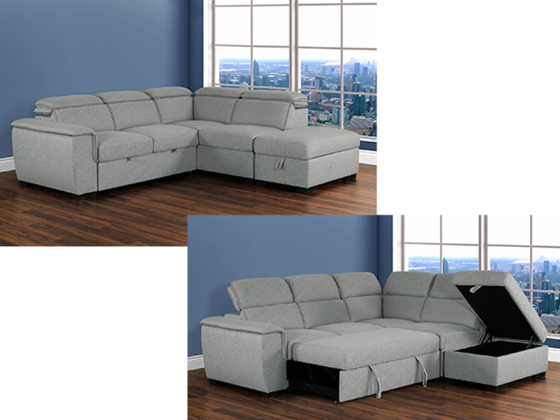 Gerardo3 contemporary multi-functional sectional and sleeper ensemble quickly and easily converts to large flat sleeping surface. Additional features include adjustable headrests and storage ottoman.
