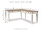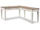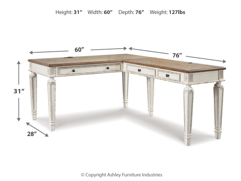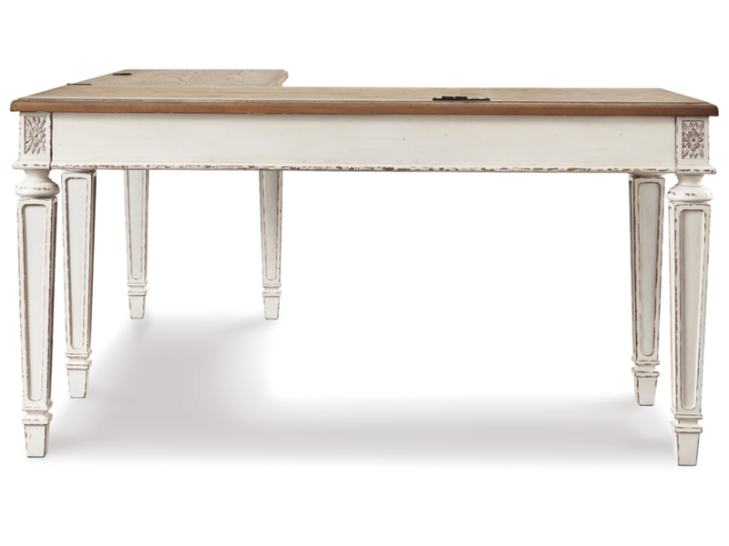 Elevating the art of traditional cottage styling, this L-shaped desk and matching bookcase is your heavenly home office realized. Two-tone finish combines chipped white with distressed wood tone tops for added charm. Framed drawer fronts, decorative corbels and elegantly turned and tapered legs add refinement, while dark bronze-tone knobs lend a classic touch. Spring lift top raises the surface to a comfortable standing position, for a healthy alternative. Built for looks and productivity, the built-in power supply and dual USB ports keep your devices close at hand and ready to go.