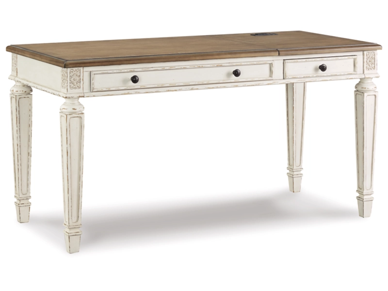 Elevating the art of traditional cottage styling, this home office package is your heavenly home office realized. The set's antiqued two-tone finish combines chipped white with a distressed wood-finish top for added charm. Framed drawer fronts, decorative corbels and elegantly turned and tapered legs add refinement, while dark bronze-tone knobs lend a classic touch.
