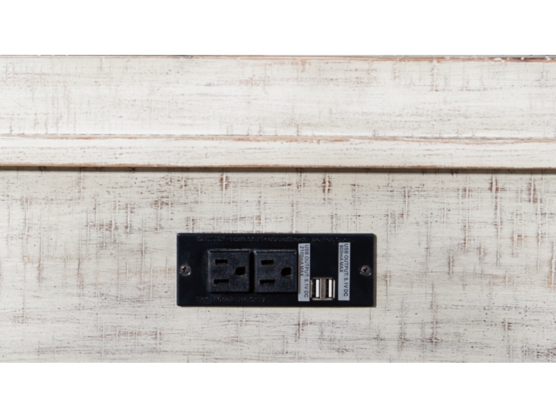 Made with Pine veneers and solids, finished in a distressed white washed color. Leg desk has canted base and two drawers for storage. Printer stand features two drawers and a lower shelf, casters for mobility and an AC power supply with (2) USB charging ports in the back side. Accent bookcase has cross buck support structure behind the shelves.