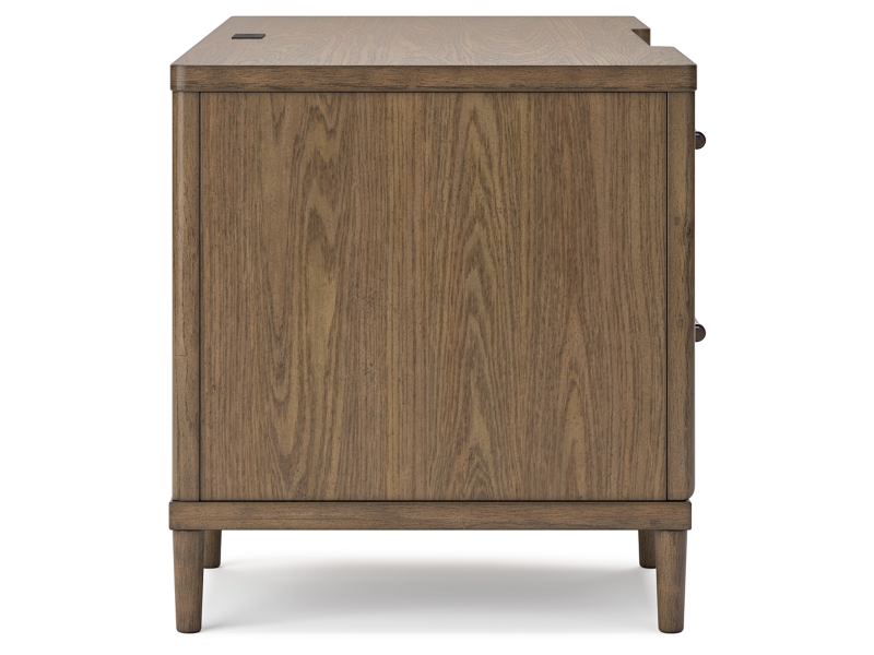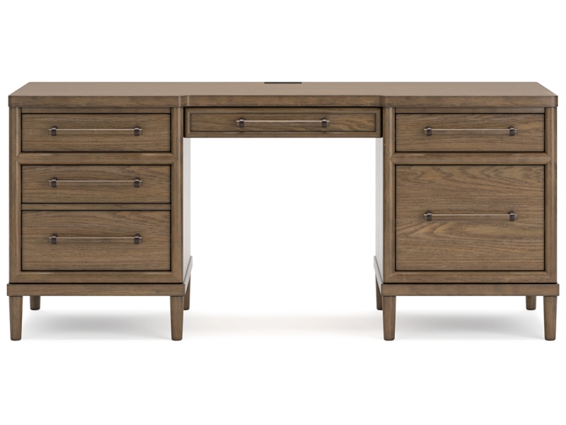 Mid-Century Modern styling. Made with hardwood solids, Oak veneer and MDF substrate. Clean, classic brown finish to enhance the Oak wood grain character, while softly rounded case frames and round tapered legs offer a mid-century appeal. Desk drawers feature French/English dovetails, fully finished interiors and heavy duty ball-bearing side glides. Desk features 5 standard drawers, a file drawer and 110V power supply with USB-A / USB-C charging ports. Solid wood drawer pulls are set with metal keepers for a casual look. The 54" wide book shelf has 5 spacious shelves with thick solid wood frames and a stylish back brace set with metal hook and keepers.