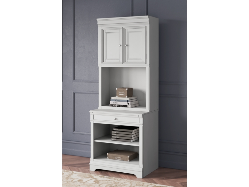 Make a style statement with this home office bookcase. Its traditional design is updated with an on-trend distressed whitewash finish. A hutch with LED underlighting shines a light on those elusive reading glasses and other desktop items. The bookshelf, drawer and cabinet space add up to a well-organized work area.