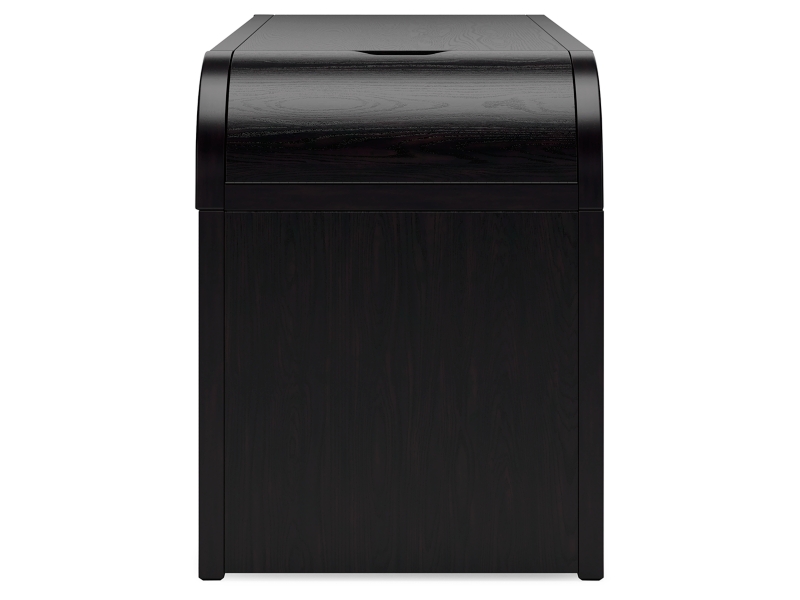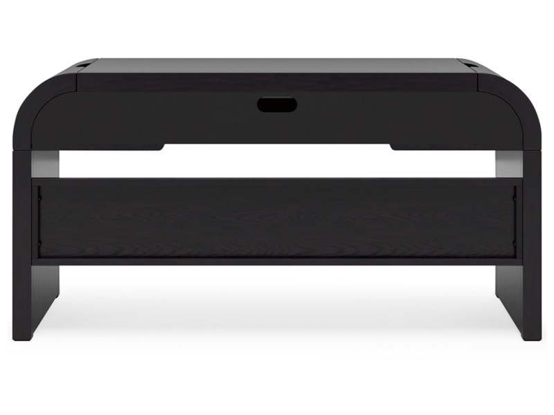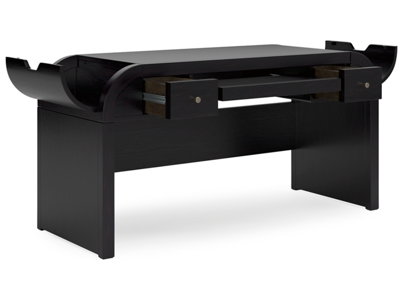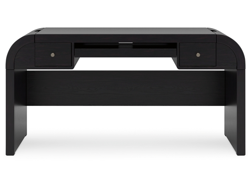Inspired by art deco design, this softly shaped home office desk makes a lasting impression in a simply stunning way. Its magnificent curved silhouette is enhanced by a rich layered black finish on the textured wood grain surface. Complete with ample storage, a pull-out keyboard tray and USB charging, this is the all-in-one piece you’ve been looking for to elevate your contemporary workspace decor.