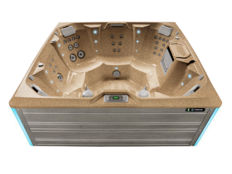 This premium spa offers seating for seven and an open seating design. With a central foot pod and jets that hit everyone's feet at once, it's an ideal conversation hub.