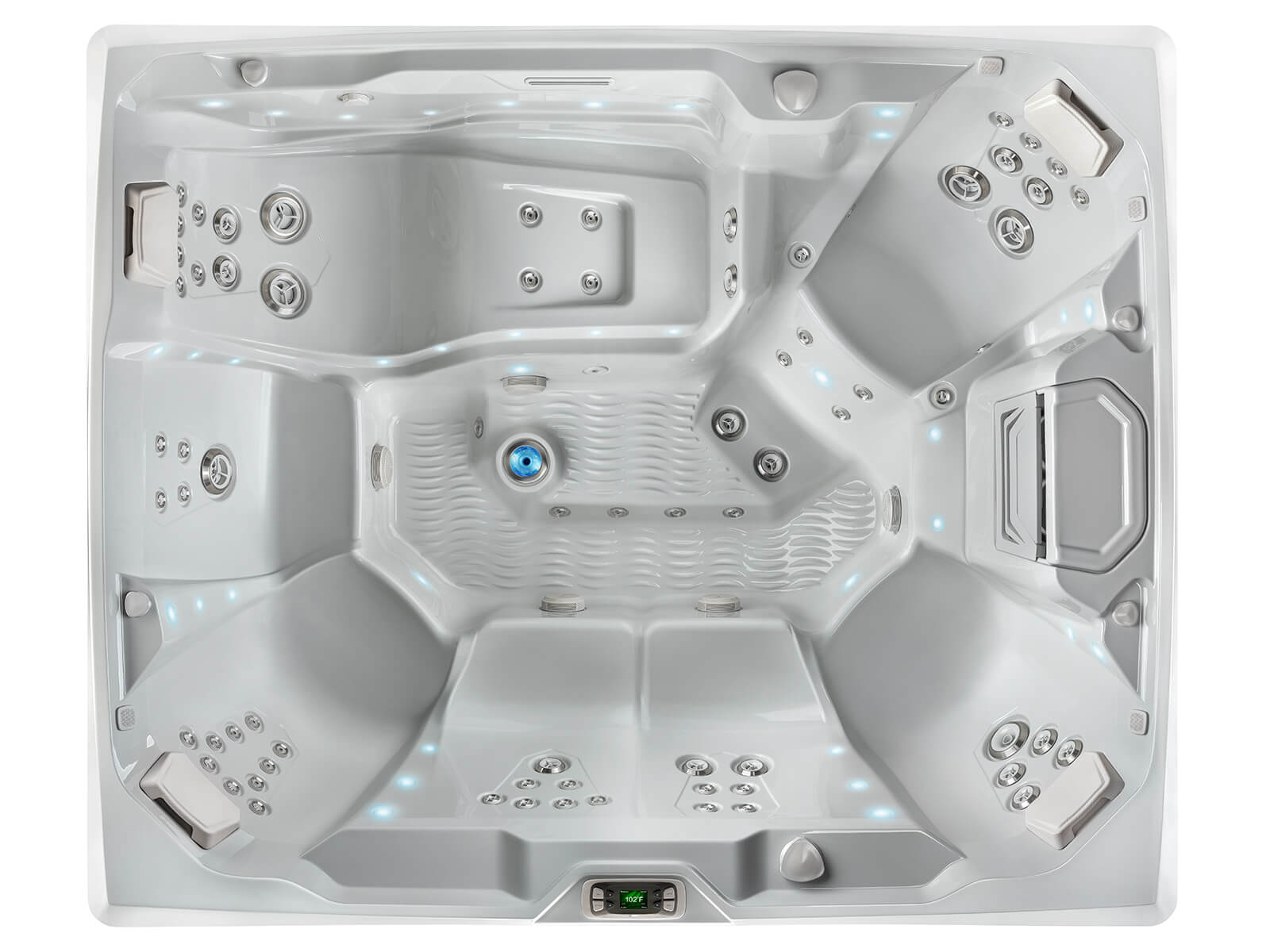 The interior lighting system features multiple points of LED light that accent the contours of the spa shell. Two exterior LED lights integrate with the front corners of the spa, creating an elegant look.