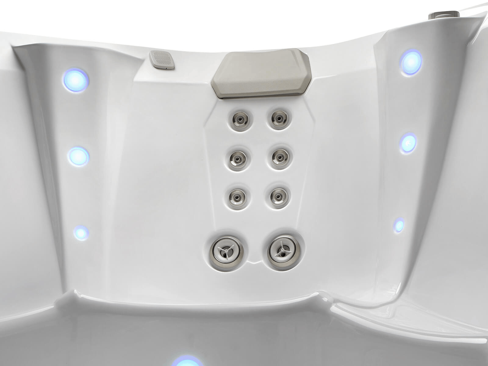 The interior lighting system features multiple points of LED light that accent the contours of the spa shell. Two exterior LED lights integrate with the front corners of the spa, creating an elegant look.