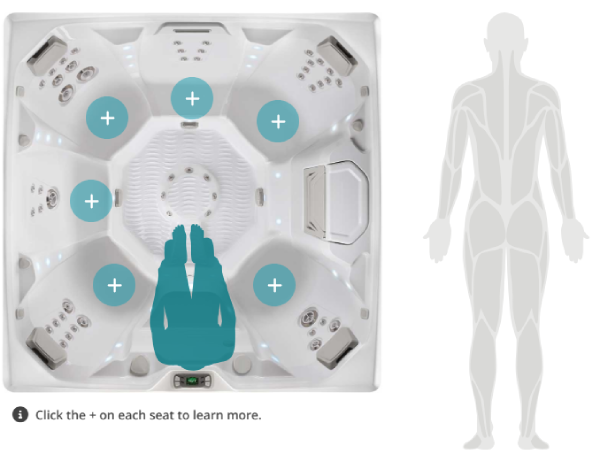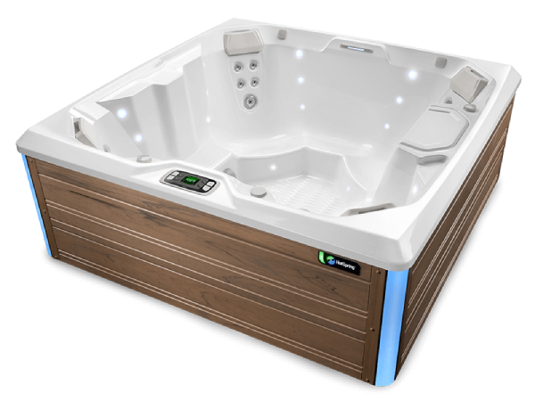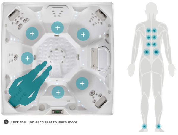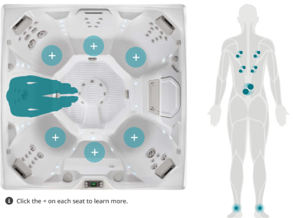 This premium spa offers seating for seven and an open seating design. With a central foot pod and jets that hit everyone's feet at once, it's an ideal conversation hub.