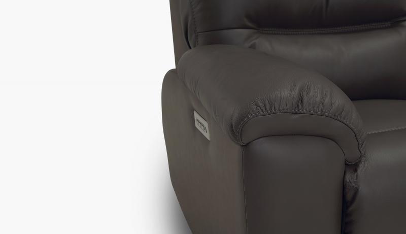This stunning motion collection is sure to draw attention, but lush, sophisticated aesthetics are only the beginning of the Keiran experience. Blown-fiber backs and high-density foam seats combine with pillow-top arms for unparalleled comfort that you can fully sink into. A triple-bolstered back brings a structured drama to the look, accented by double topstitch details on the back and seat. Power headrest, recline, and lumbar offer infinite opportunities for creating the perfect position, while wall-hugger technology ensures a full recline with as little as 4" of wall clearance. A full pad-over chaise leaves no part of your leg unsupported and creates a streamlined look, with a higher chair back and extended footrest that makes this collection a fitting choice for taller customers. Every smooth movement is activated with a brushed-metal switch that features integrated USB charging. An available console loveseat reveals deep storage, cupholders, more USB charging, and a grommet with optional add-ons including tablet stands, tables and LED flex lights. Bringing a more modern look to the comfort and convenience of motion furnishings, the Keiran will soon become a cherished place to recharge at the end of a long week. Only available at select retailers.