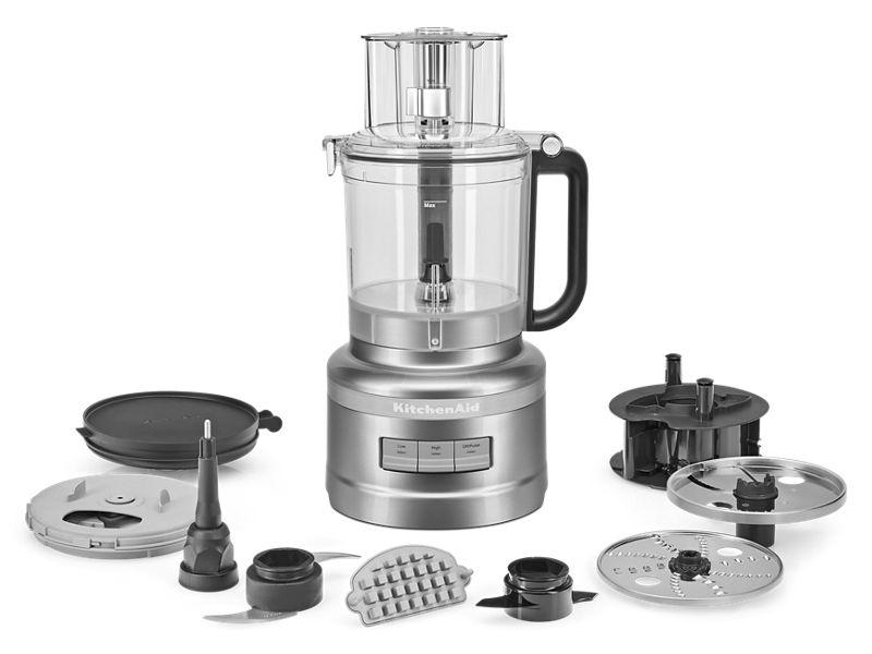 (1) food processor, (1) 13-cup work bowl, (1) multi-purpose blade, (1) adjustable slicing disc (1) dicing kit with cleaning tool, (1) refrigerator lid, (1) reversible shredding disc, (1) dough blade, (1) storage caddy