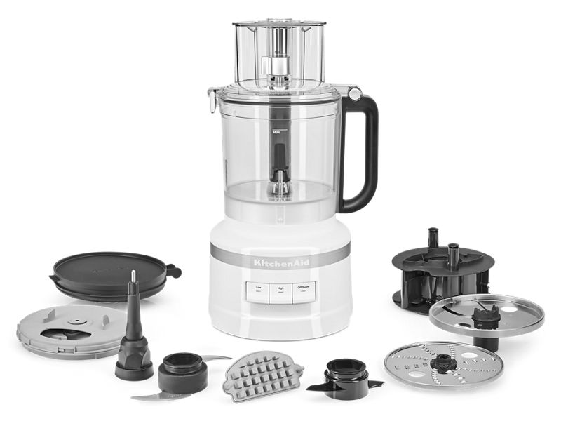 (1) food processor, (1) 13-cup work bowl, (1) multi-purpose blade, (1) adjustable slicing disc (1) dicing kit with cleaning tool, (1) refrigerator lid, (1) reversible shredding disc, (1) dough blade, (1) storage caddy