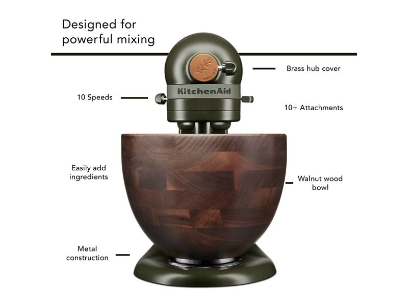 Introducing Evergreen, a KitchenAid® Design Series Stand Mixer. Evergreen brings the essence of the outdoors within, so you can come alive in the kitchen every single time you use it. Ground yourself in natural elements of Evergreen: deep, forest green and a true, walnut wood bowl.