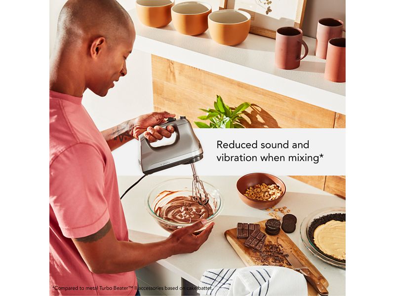 Compact, lightweight and great for your everyday mixing needs. This hand mixer features 6 speeds, 2 Flex Edge Beaters and the power and control to mix up your favorite cookie dough, mashed potatoes and so much more. Slowly stir in chunky ingredients, like nuts or chocolate chips, at speed one or whip egg whites or heavy cream at speed six. The Flex Edge Beaters deliver 2X the surface area for faster, more thorough mixing,* and also reduces the need to scrape down sides of the bowl, when compared to metal beaters. When you're finished mixing, you can securely store your accessories with the integrated storage clip that attaches to the underside of your mixer, eliminating the need for bulky containers and/or storage boxes. *Compared to metal Turbo Beater™ II accessories based on cake batter.