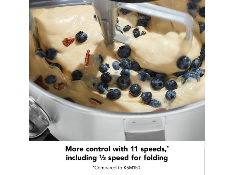 Up your culinary caliber with 2x the power in the bowl than our Tilt Head Stand Mixer.* Professional-style performance paired with a 3-point locking bowl provides you with stability for mixing heavy, dense ingredients. Designed with 11 distinct speeds, including 1/2 speed, you'll have power and control from high to low, and everything in between. So no matter if you're folding, kneading, mixing, shredding, or beating, the KitchenAid® 7 Quart Bowl-Lift Stand Mixer is designed to take it all on. To amplify your creativity, explore 10+ stand mixer attachments, each with the power to open a world of untapped cooking techniques, experimentation and inspiration.** *Compared to KSM150 when measuring peak HP in the bowl; above speed 2.**Attachments sold separately.