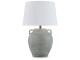 Antique green finished terracotta table lamp. Modified drum hardback shade. 3-way switch. (1) E26 socket, type A bulb recommended - 150 watts max or 25 watts max CFL. Due to the finishing process of this product, some variations may occur.
