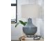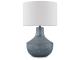 Antique gray and white finished hammered aluminum table lamp. Drum hardback shade. 3-way switch. (1) E26 socket, type A bulb recommended - 150 watts wax or 25 watts max CFL. Due to the hand crafted nature of this product, some variations may occur.