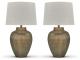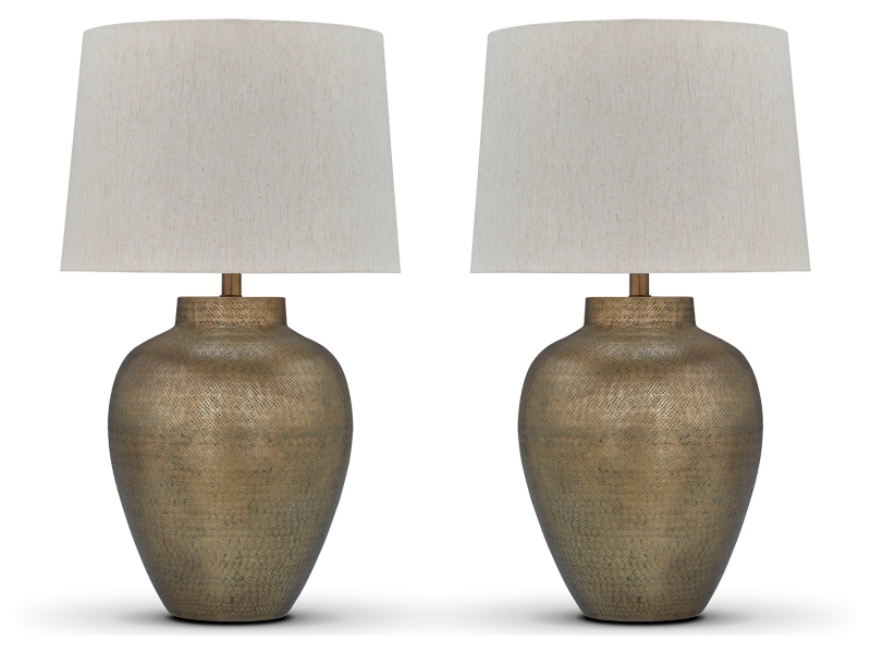 Stay on trend with lighting that exudes artisan refinement. Crafted from hammered aluminum with a goldtone patina finish, this table lamp set fills a room with well-lit splendor. Simple in shape, it adds striking texture to your home.