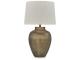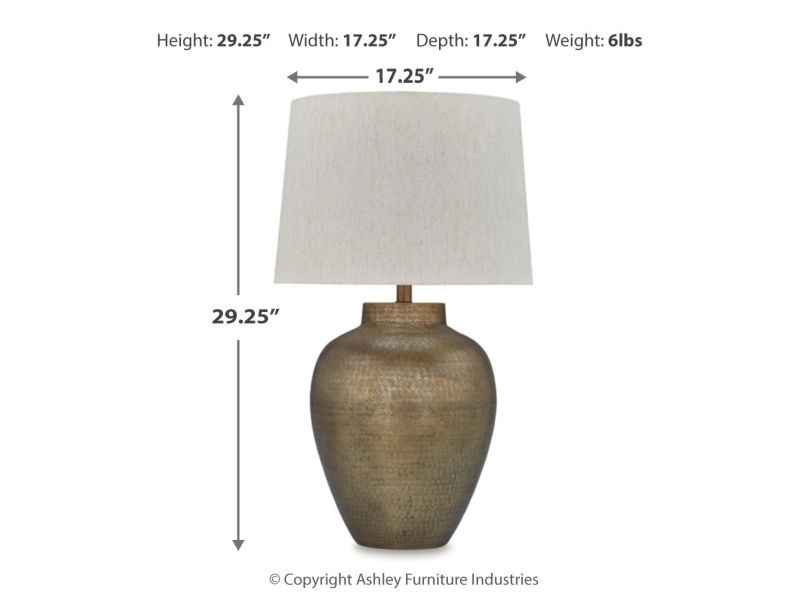 Antique gold patina finished hammered aluminum table lamp. Modified drum hardback shade. 3-way switch. (1) E26 socket, type A bulb recommended - 150 watts wax or 25 watts max CFL. Due to the hand crafted nature of this product, some variations may occur.
