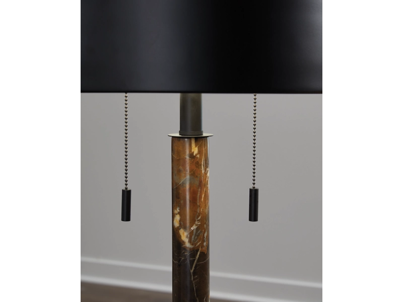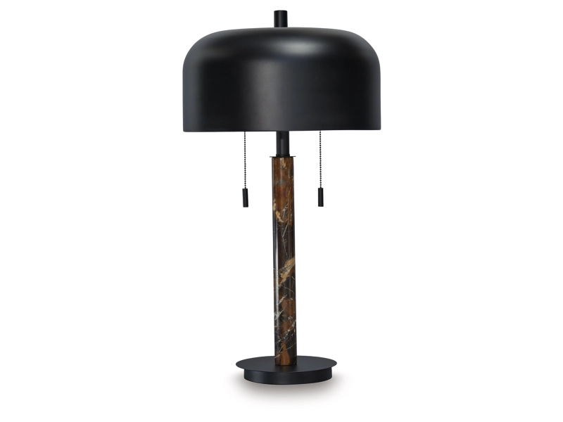 Dark brown marble and black finished metal table lamp. Metal dome shade. On-off pull-chain switch. (2) E26 socket, type A bulb recommended - 60 watts max. Matching floor lamp - L208451. Due do the use of natural materials, some variations may occur.