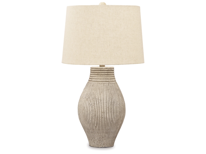 Antique beige finished paper composite table lamp. Modified drum hardback shade. 3-way switch. (1) E26 socket, type A bulb recommended - 150 watts max or 25 watts max CFL.