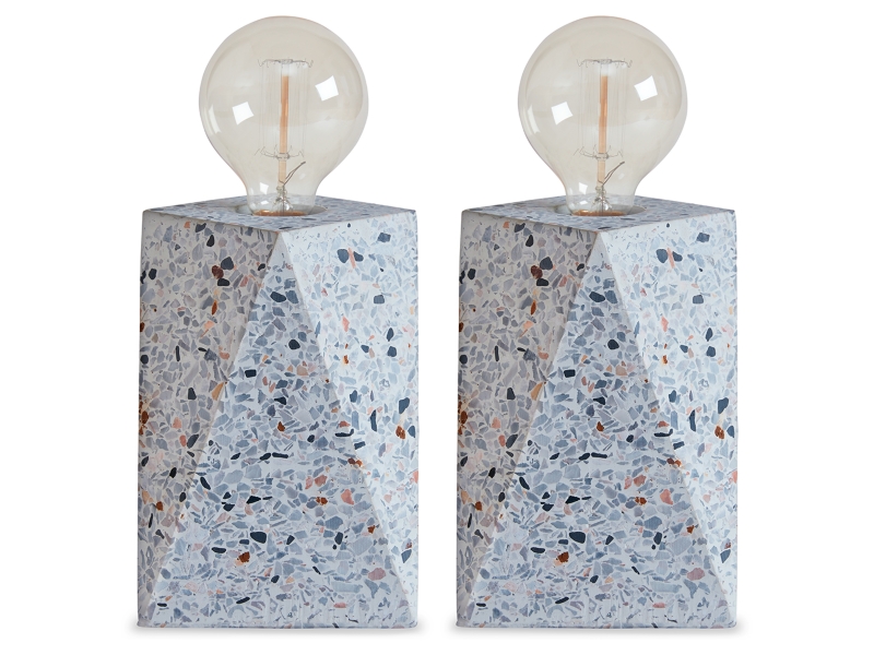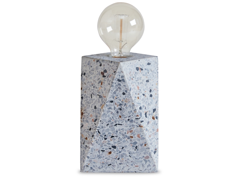 Off-white terrazzo table lamp. In-line on/off switch. (1) E26 socket, type A bulb recommended - 40 watts max or 8 watts max CFL. Due to the use of natural materials, some variation may occur.
