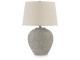 Heavily textured distressed gray finished metal table lamp. Modified drum hardback shade. 3-way switch. (1) E26 socket, type A bulb recommended - 150 watts max or 25 watts max CFL. Due to the finishing process of this product, some variations may occur.