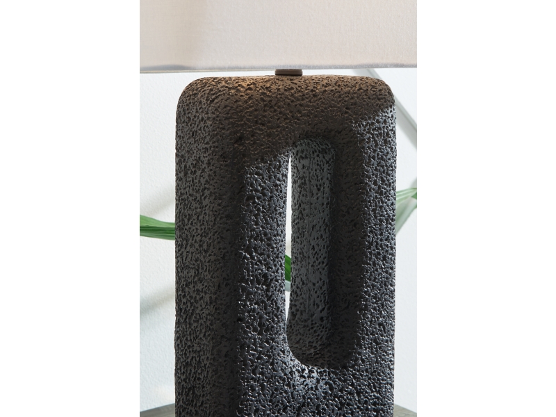 Heavily textured black finished poly resin table lamp. Rounded corner rectangle hardback shade. 3-way switch. (1) E26 socket, type A bulb recommended - 100 watts max or 23 watts max CFL.