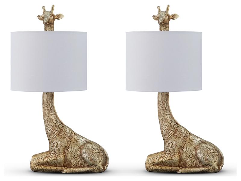 This giraffe lamp set combines contemporary style with eclectic charm. The curious animal peeks out over the top of the shade, adding a playful touch to the safari-inspired vibe. For glam appeal, a goldtone finish completes the look.