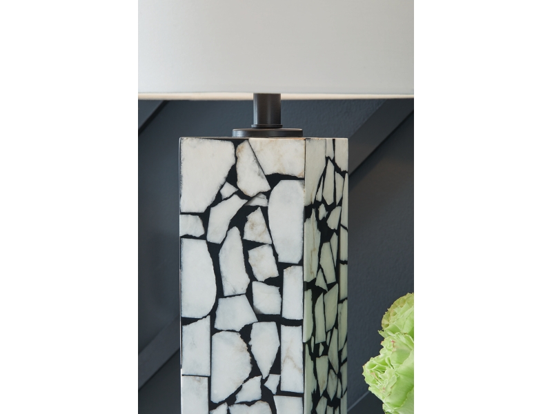 This exquisite table lamp is artfully adorned, with a mosaic pattern of white marble playing beautifully against a black background. Complemented by a modified drum shade for a sophisticated sensibility, the lamp casts an elegant glow in the entryway or living area.