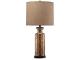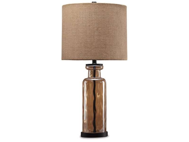 Transparency is in style with this table lamp set. A unique pattern reflects in the faceted base as light passes through. Antique bronze-tone metal beautifully complements the champagne glass finish. Burlap shade adds texture to the smooth design.