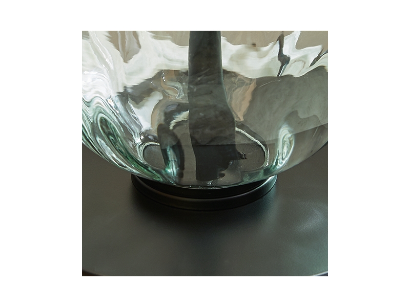 Clear wave glass and black finished metal table lamp. Drum hardback shade. 3-way switch. (1) E26 socket, type A bulb recommended - 150 watts max or 25 watts max CFL.