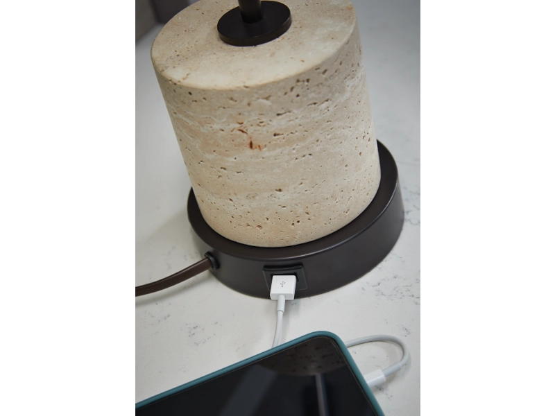 Dark brown finished metal and travertine desk lamp. Metal shade. (1) USB-C charging port. On-off switch. LED bulb (not replaceable). Due do the use of natural materials, some variations may occur.