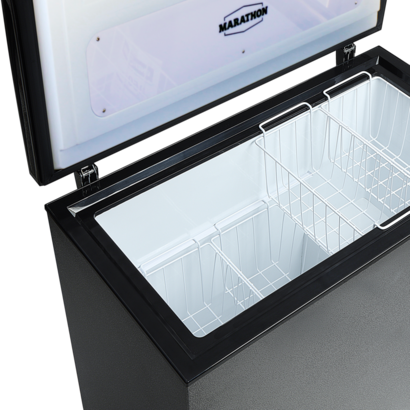 Your favourite foods will be safely preserved and easily organized in this spacious Marathon 7.1 cu.ft. Premium Chest Freezer. In a unique, durable granite finish, this freezer comes with an innovative 2-tiered Double-Row Basket design for easy storage and organization of your favourite frozen goods. Features include an advanced high-temperature alarm monitoring system for added peace of mind and a new and improved bright LED interior light for enhanced visibility. Other features include a heavy-duty white aluminum liner, defrost drain, 4 baskets, power and compressor light, safety lock and handle, and front adjustable thermostat and defrost drain. Marathon appliances are "Engineered to Perform" and are backed by the Industry's Best 2-Year Parts and Labour Warranty