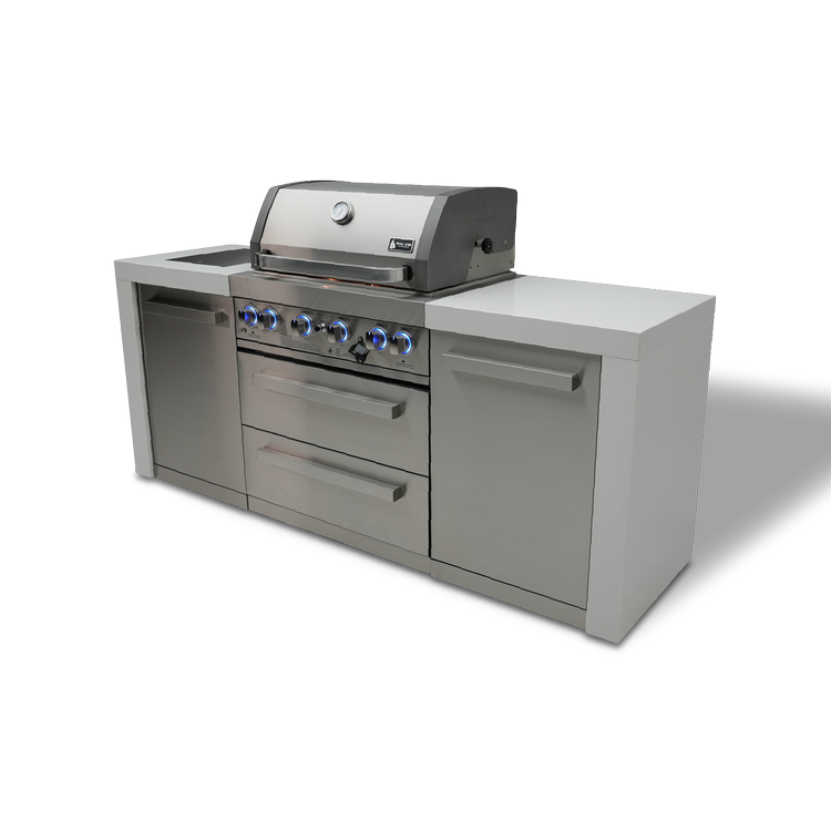 All Mont Alpi Deluxe outdoor kitchens are propane ready but can be easily converted to natural gas with the additional Mont Alpi Natural Gas conversion kit. With its white granite surfaces and waterfall sides, this grill is the perfect combination of class and convenience. Delivered fully assembled, it's the ultimate grill for any outdoor cooking enthusiast.