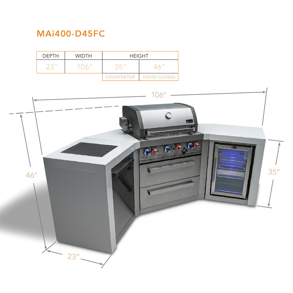 Mont Alpi 4 Burner Deluxe Island With 45 Degree Corners and a Fridge Cabinet - MAi400-D45FC
