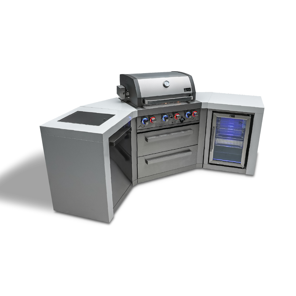 Introducing the Mont Alpi 4-burner Deluxe Island with 45-Degree Corners and a Fridge Cabinet - the perfect centerpiece for your outdoor entertaining. With 45-degree angle modules, white granite surfaces and waterfall sides, the MAi400-D45FC adds a touch of elegance to any space.