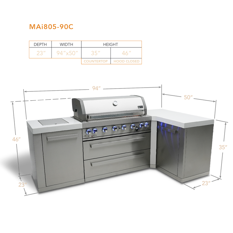 Looking for a grill that's the perfect blend of power and ease? Look no further than the Mont Alpi 6-burner island with a 90-degree corner. With its tried-and-tested design, the MAi805-90 features six burners, an infrared side burner for searing, pan frying, and boiling, and an infrared rear burner for the ultimate rotisserie experience. Plus, with LED knob lights and bright internal cooking lights, you'll have precise control over every dish you cook.