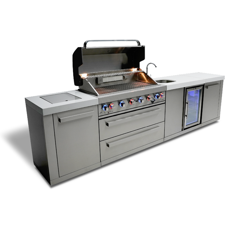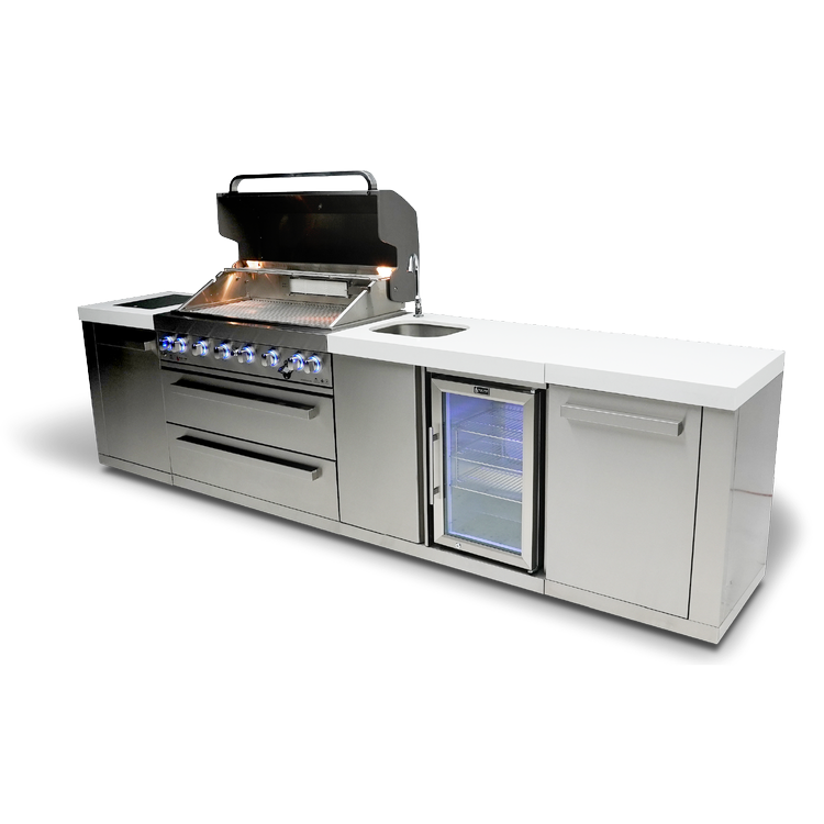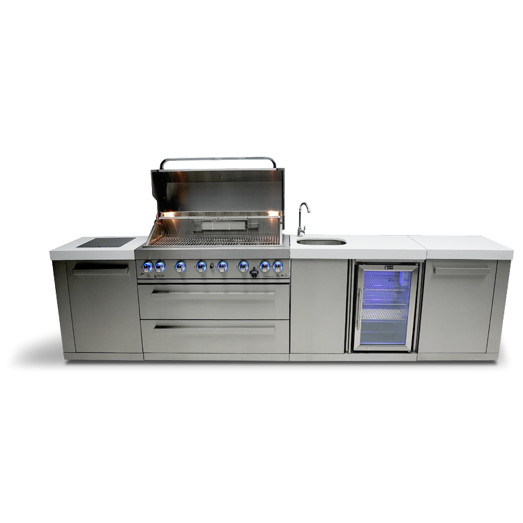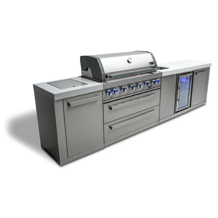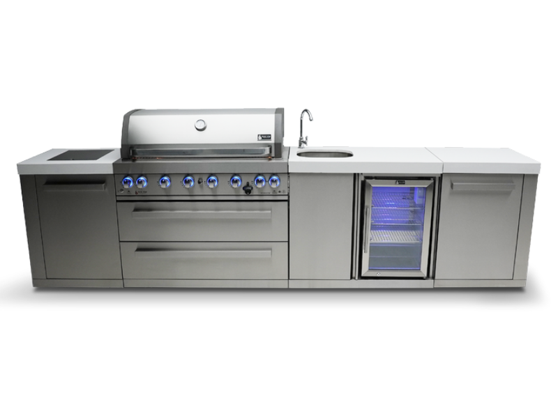 Get ready to elevate your outdoor cooking and entertaining game with the Mont Alpi 6-burner island with a beverage center - the perfect companion for outdoor entertaining. With six burners, an infrared side burner, and an infrared rear burner, the MAi805-BEV is versatile and delivers peak performance every time. The LED knob lights and bright internal cooking lights ensure precise control over your culinary creations, while the sleek counter granite surfaces make cleaning up a breeze.