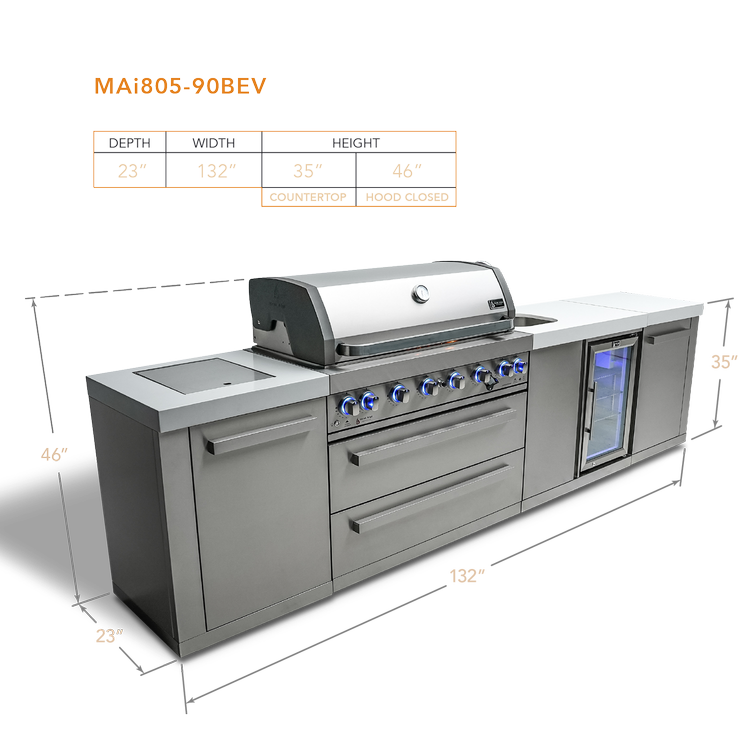 The MAi805-BEV is propane-ready but can easily be converted to natural gas with the Mont Alpi Natural gas conversion kit. Combining style, functionality, durability, and peak performance, it's the perfect grilling companion for any outdoor gathering. Impress your guests and satisfy your grilling needs with the Mont Alpi 6-burner island with a beverage center.