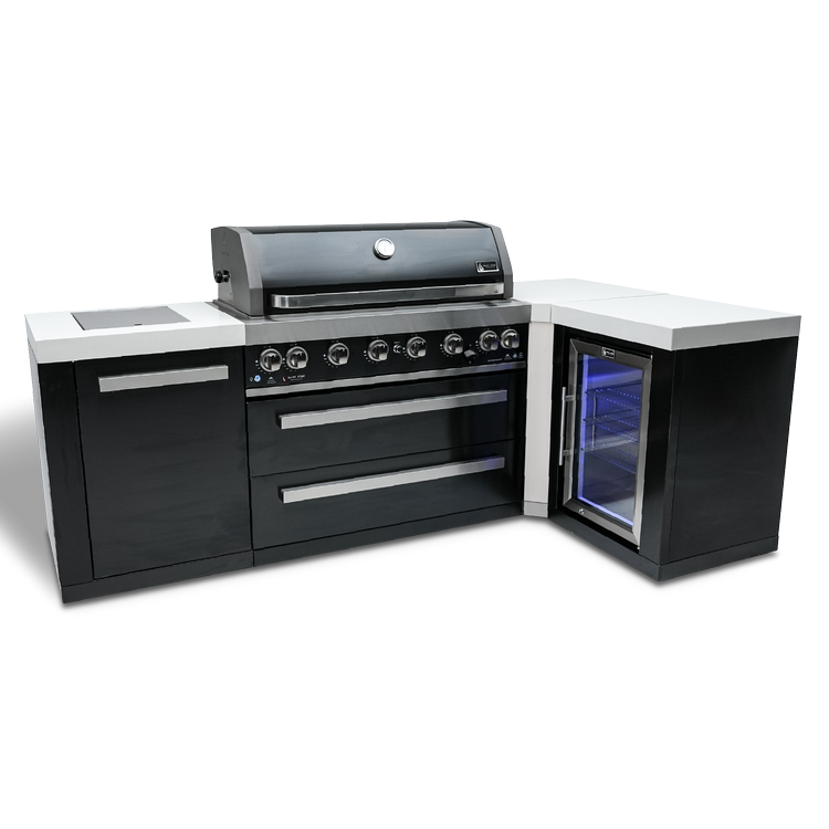 Upgrade your outdoor cooking game with the Mont Alpi Black Stainless Steel Island, featuring a 90-degree corner and a fridge cabinet. This grill combines style and durability, boasting six standard burners, an infrared side burner, and an infrared rear burner with a heavy-duty rotisserie kit for the ultimate cooking experience.