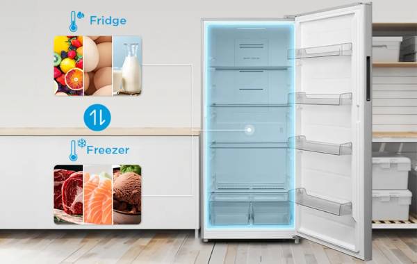 Enjoy versatile storage solutions with a convertible freezer that effortlessly switches between freezer and refrigerator modes. This adaptability optimizes space for frozen items, perishable foods, and beverages, ensuring efficient use according to your specific storage needs.