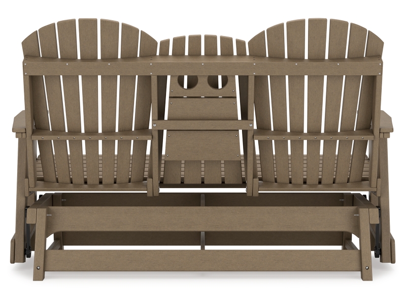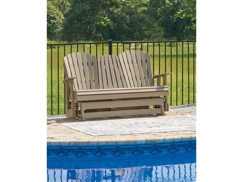 Drift away from everyday worries and into outdoor bliss with this glider loveseat. Dressed in an inviting driftwood hue, the Adirondack-inspired design has a classic feel. It weathers sunny summer days and cozy winter nights with durable MEGA-TUFF® HDPE material. A drop-down console with integrated cup holders keeps refreshments and snacks within easy reach. With the console snapped into the back, this loveseat has even more room for enjoying lazy days in the shade.