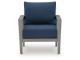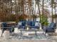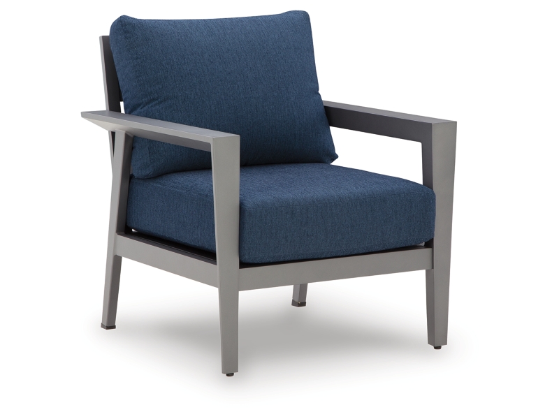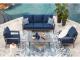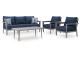 Aluminum. Nuvella high performance navy blue fabric. Includes two throw pillows. 4 piece set in one carton. Assembly required.