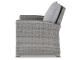 Millennium cushioned modular sectional. Hand woven light gray and black resin wicker on an aluminum frame with hand applied wood look finish. Gray Nuvella premium high performance fabric. Stainless steel hardware. P439-854 has 4 throw pillows. P439-877 has 2 throw pillows. Assembly required.