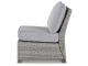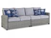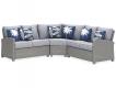 Millennium cushioned modular sectional. Hand woven light gray and black resin wicker on an aluminum frame with hand applied wood look finish. Gray Nuvella premium high performance fabric. Stainless steel hardware. P439-854 has 4 throw pillows. P439-877 has 2 throw pillows. Assembly required.