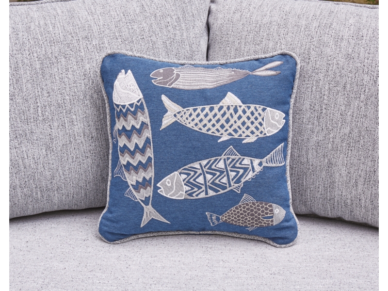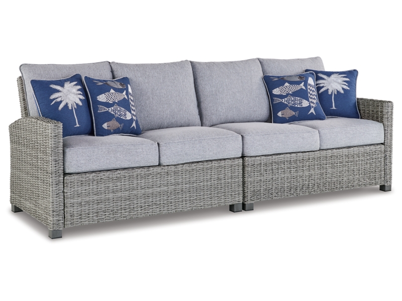 Millennium cushioned modular sectional. Hand woven light gray and black resin wicker on an aluminum frame with hand applied wood look finish. Gray Nuvella premium high performance fabric. Stainless steel hardware. P439-854 has 4 throw pillows. P439-877 has 2 throw pillows. Assembly required.
