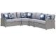 Millennium cushioned modular sectional. Hand woven light gray and black resin wicker on an aluminum frame with hand applied wood look finish. Gray Nuvella premium high performance fabric. Stainless steel hardware. P439-854 has 4 throw pillows. P439-877 has 2 throw pillows. Assembly required.