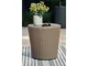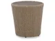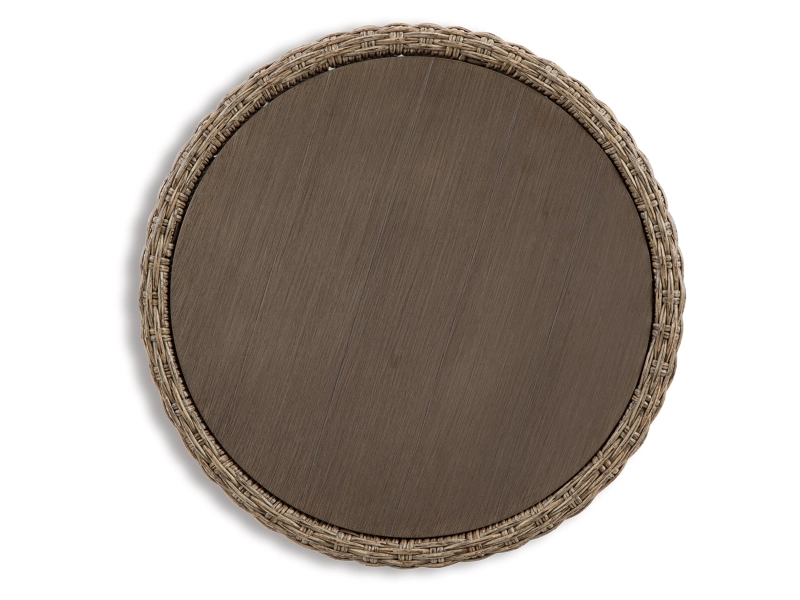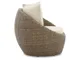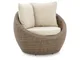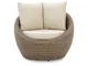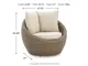 Millennium cushioned swivel lounge chair with 2 table options. Resin wicker hand woven on a powder coated aluminum frame. Beige Nuvella premium fabric. Tables have an aluminum top.