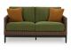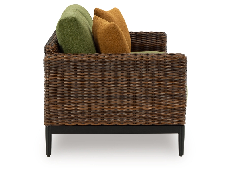 Millennium Collection. Wood-look aluminum tables. Nuvella+ high performance green fabric. Assembly required. Loveseat includes two throw pillows and sofa includes four throw pillows.